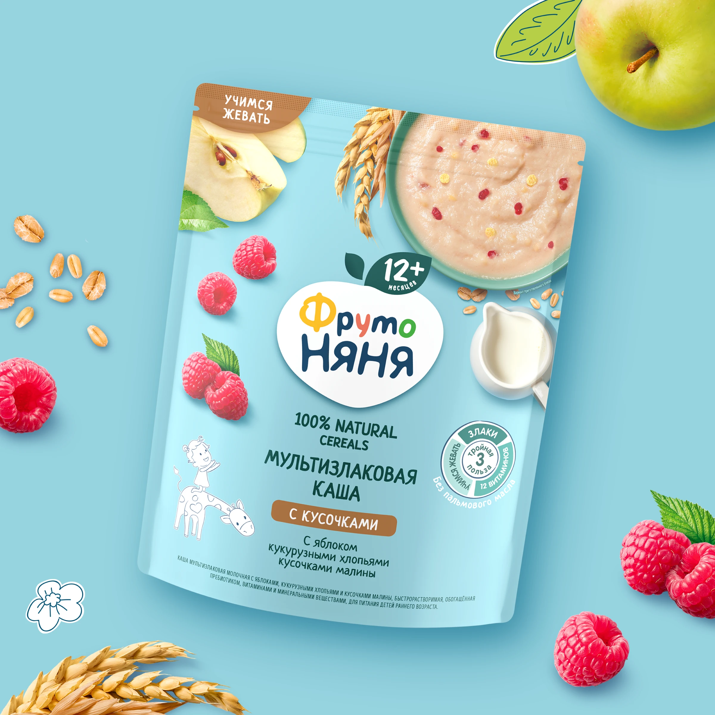 Wheat flour, skimmed milk powder, sugar, whole milk powder, oat flour, extruded cereal and grain product: corn flakes (corn grits, sugar, salt), corn oil, corn flour, apple puree, dry raspberry pieces (raspberry puree, sucrose, corn starch), prebiotic: inulin, vitamins (C, E, PP, pantothenic acid, B2, B1, B6, A, folic acid, D3, biotin, B12), minerals (iron, zinc, iodine).