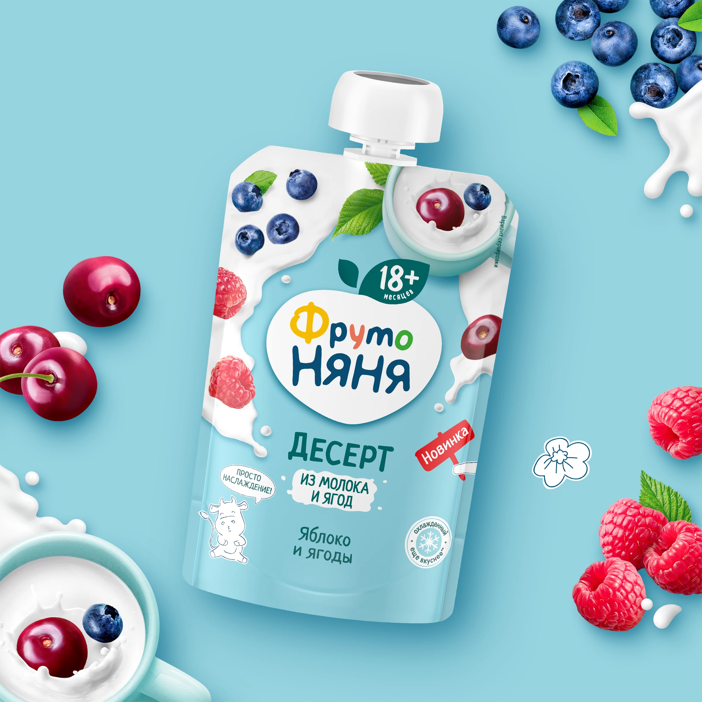 Apple puree, sugar, blueberry puree, whole milk powder, cherry puree, corn starch, stabilizer: pectin, chokeberry juice concentrate, raspberry puree, blackcurrant puree, thickening agent: xanthan gum, ascorbic acid (vitamin C), acidity regulator: citric acid, drinking water.