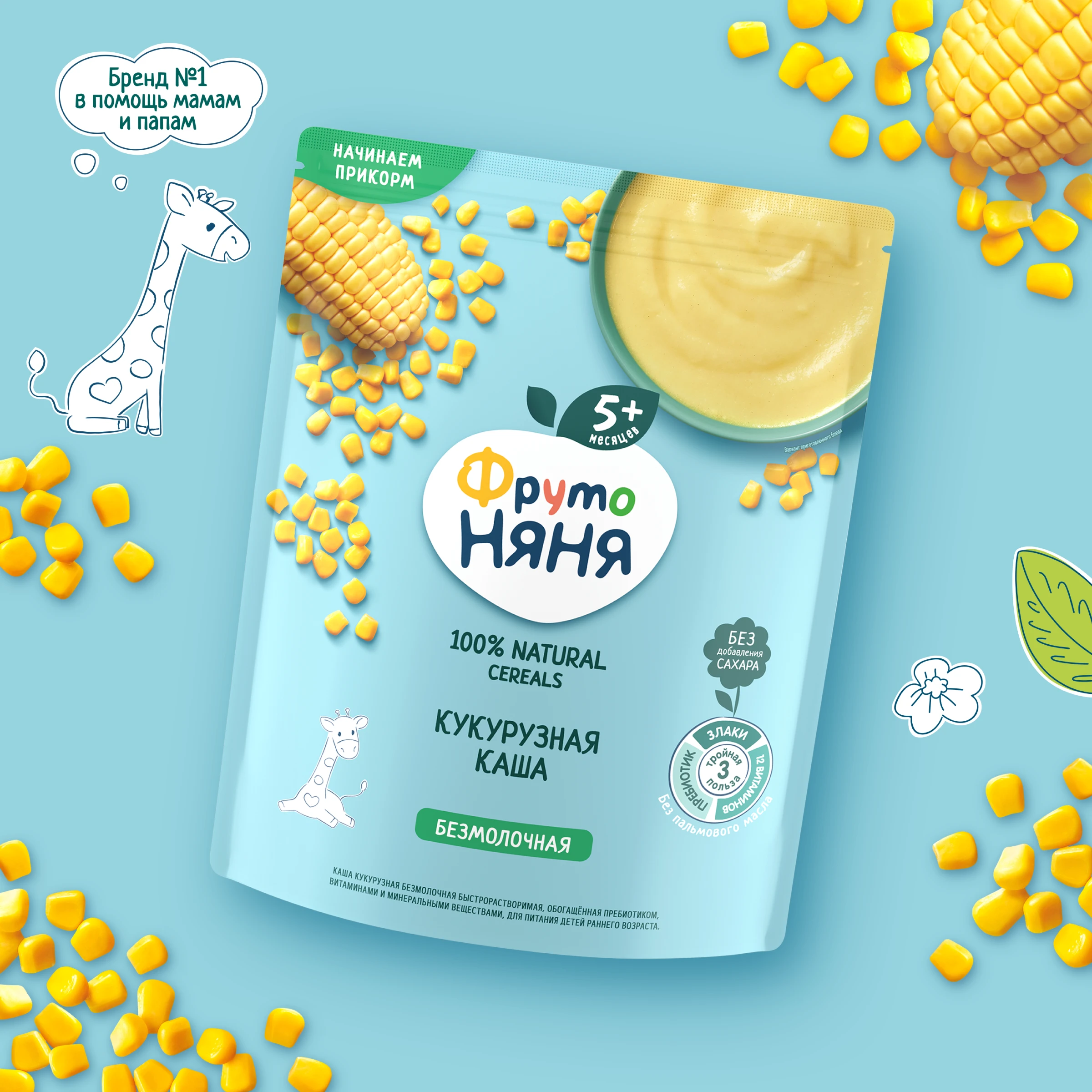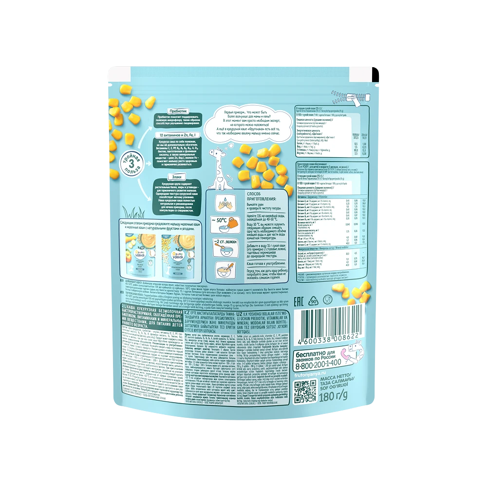 Corn flour, prebiotic: inulin, vitamins (C, E, PP, pantothenic acid, B2, B1, B6, A, folic acid, D3, biotin, B12), minerals (iron, zinc, iodine).