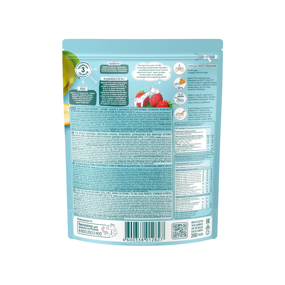 Skimmed milk powder, wheat flour, sugar, oat flour, cream powder, corn flour, corn oil, prebiotic: inulin, apple puree, banana puree, strawberry puree, vitamins (C, E, PP, pantothenic acid, B2, B1, B6, A, folic acid, D3, biotin, B12), minerals (iron, zinc, iodine).