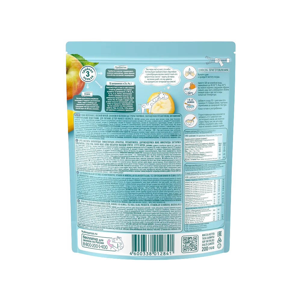 Whole milk powder, oat flour, sugar, banana puree, prebiotic: inulin, apple puree, vitamins (C, E, PP, pantothenic acid, B2, B1, B6, A, folic acid, D3, biotin, B12), minerals (iron, zinc, iodine).