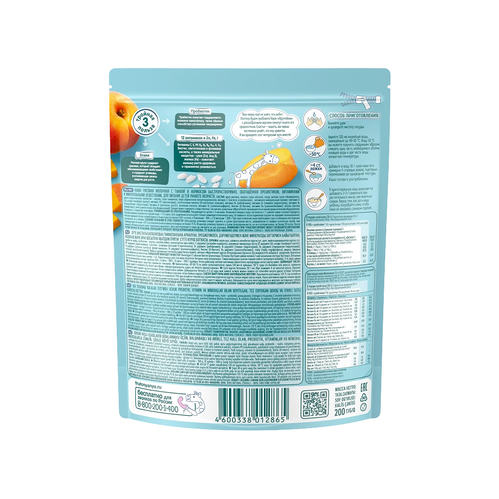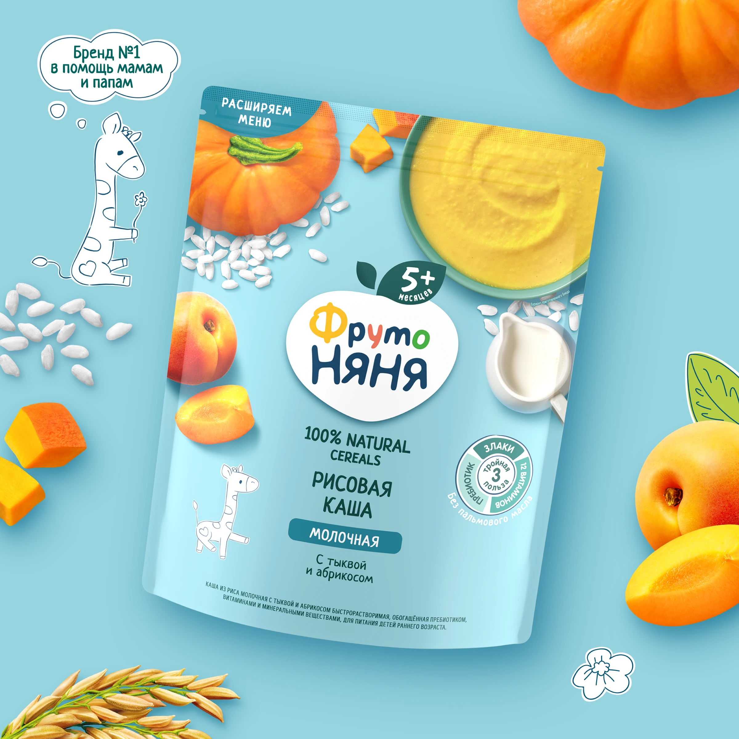 Rice flour, skimmed milk powder, sugar, cream powder, corn oil, pumpkin puree, apricot puree concentrate, prebiotic: inulin, vitamins (C, E, PP, pantothenic acid, B2, B1, B6, A, folic acid, D3, biotin, B12), minerals (iron, zinc, iodine).