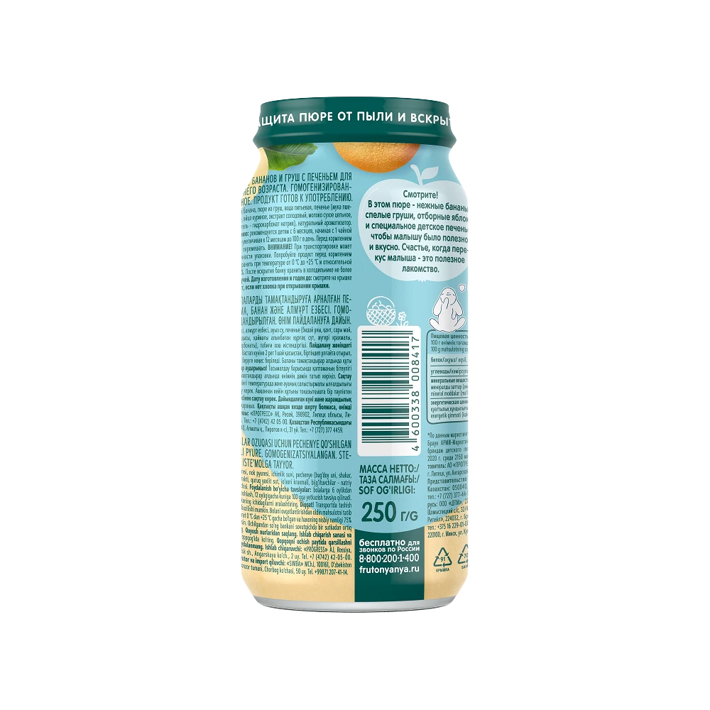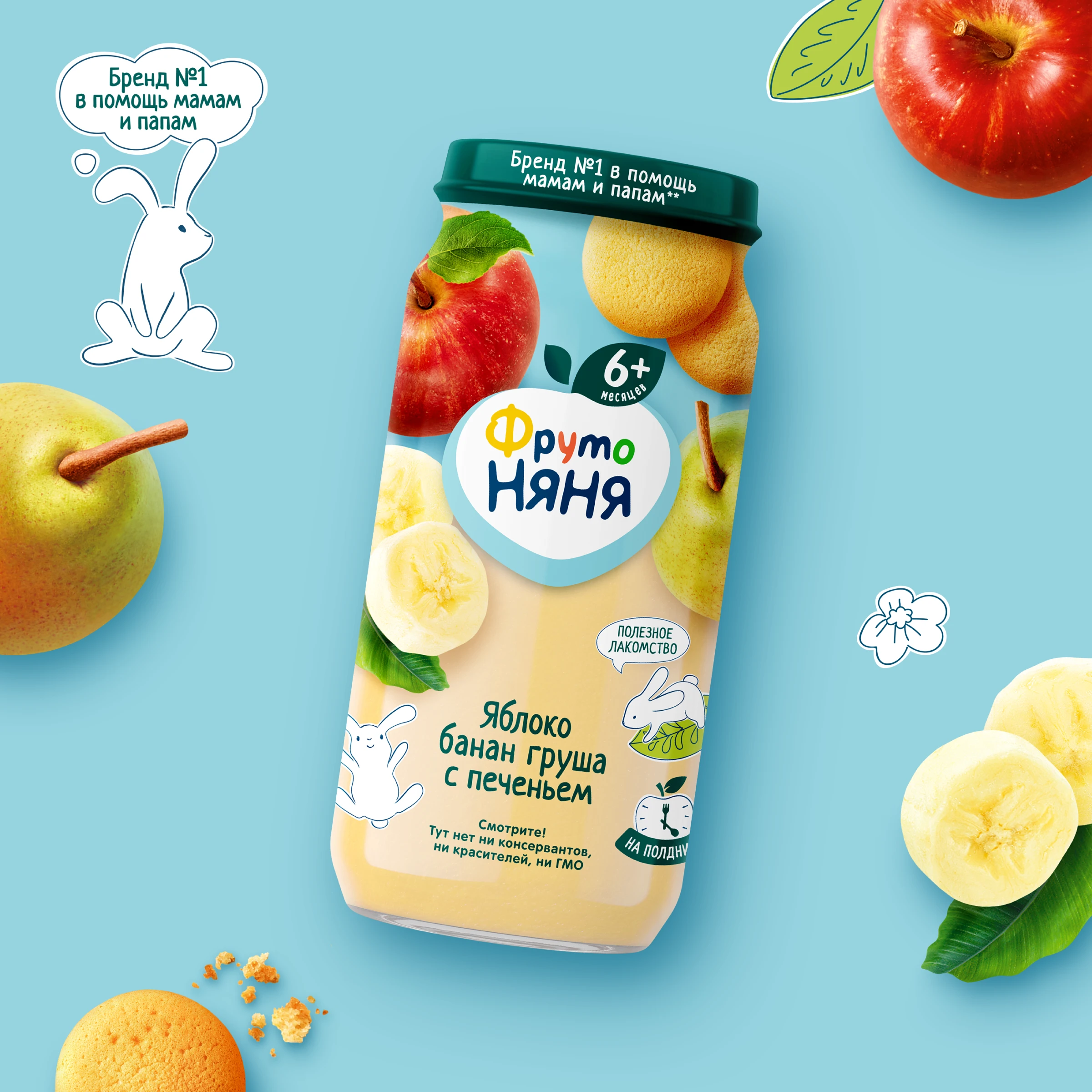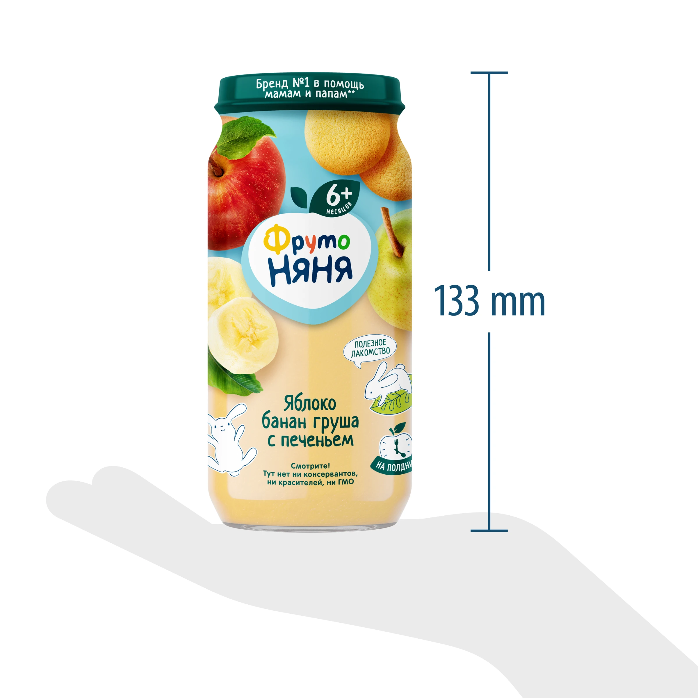 Apple puree, banana puree, pear puree, drinking water, cookies (wheat flour, sugar, butter, chicken eggs, malt extract, whole milk powder, corn starch, leavening agent: ammonium carbonates, sodium bicarbonates), natural flavoring Cookie.