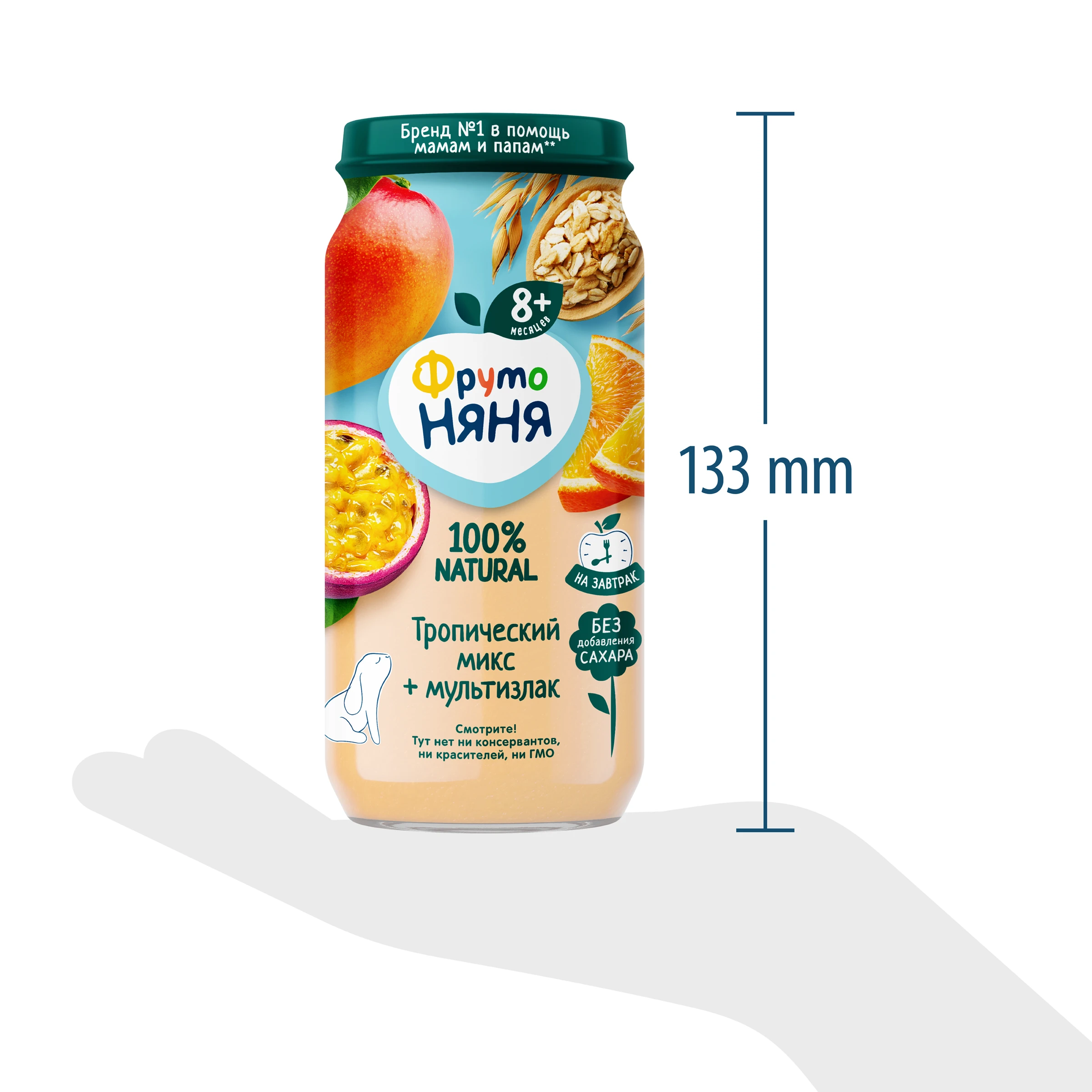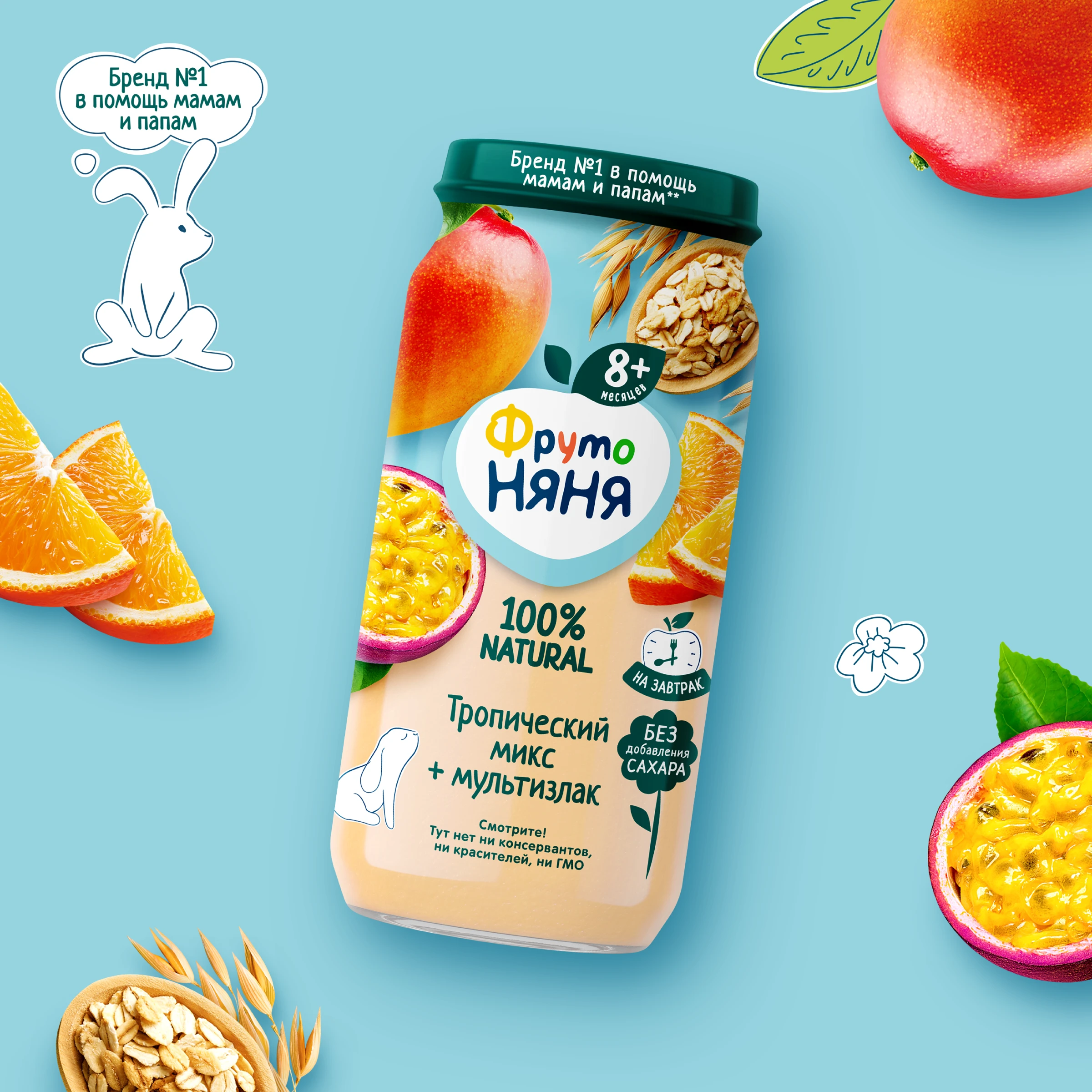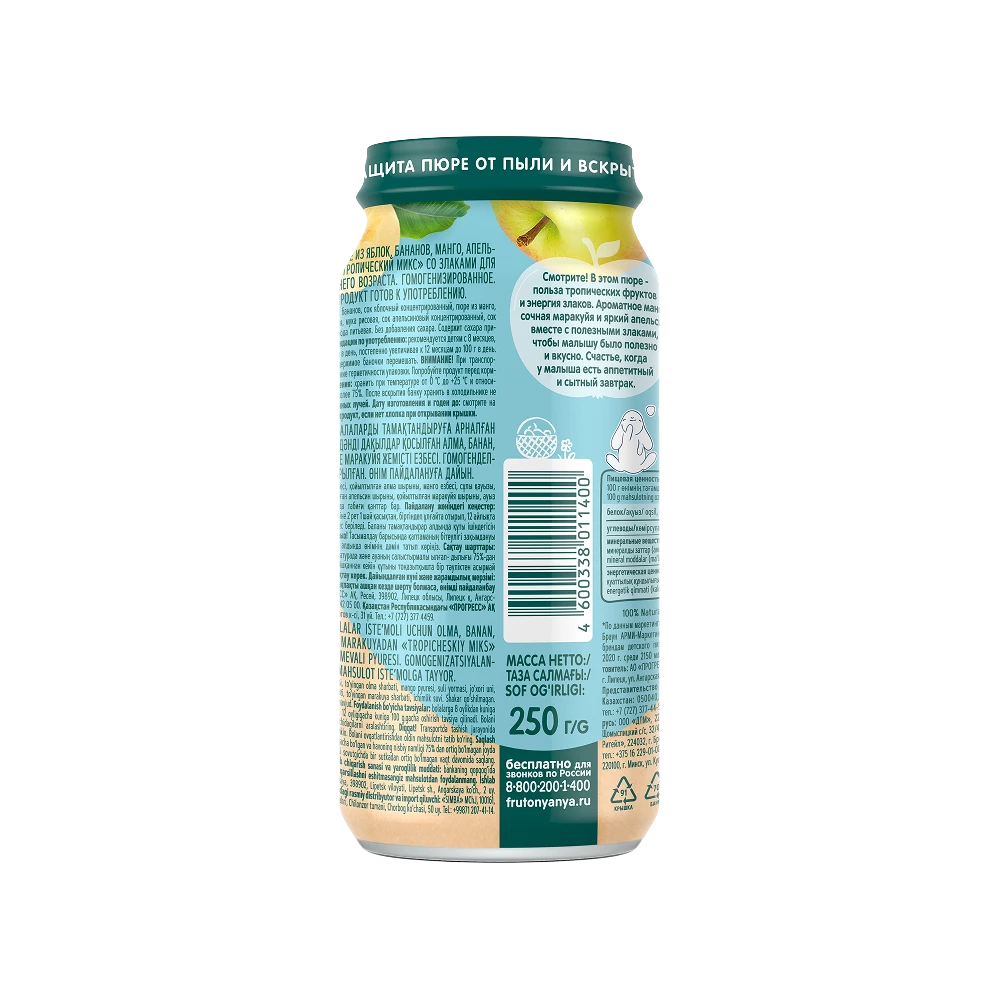 Apple puree, banana puree, apple juice concentrate, mango puree, oat flakes, corn flour, rice flour, orange juice concentrate, passion fruit juice concentrate, drinking water.
