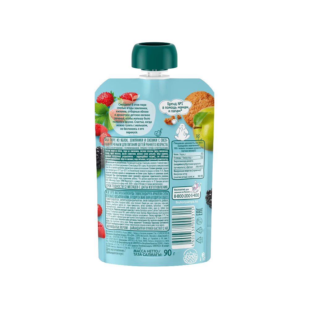 Apple puree, strawberry puree, oatmeal cookies (wheat flour, sugar, oat flour, butter, whole milk powder, chicken eggs, corn starch, leavening agent: sodium bicarbonate), apple juice concentrate, blackberry puree, drinking water, natural flavoring.