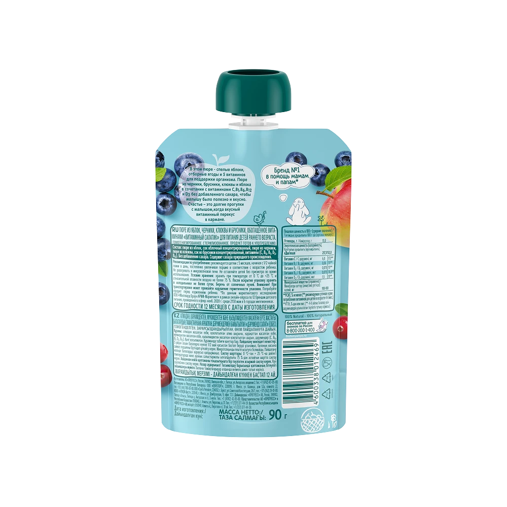 Apple puree, apple juice concentrate, blueberry puree, cranberry puree, lingonberry juice concentrate, vitamins (C, B6, B1, D3, B12). No added sugar. Contains naturally occurring sugars.