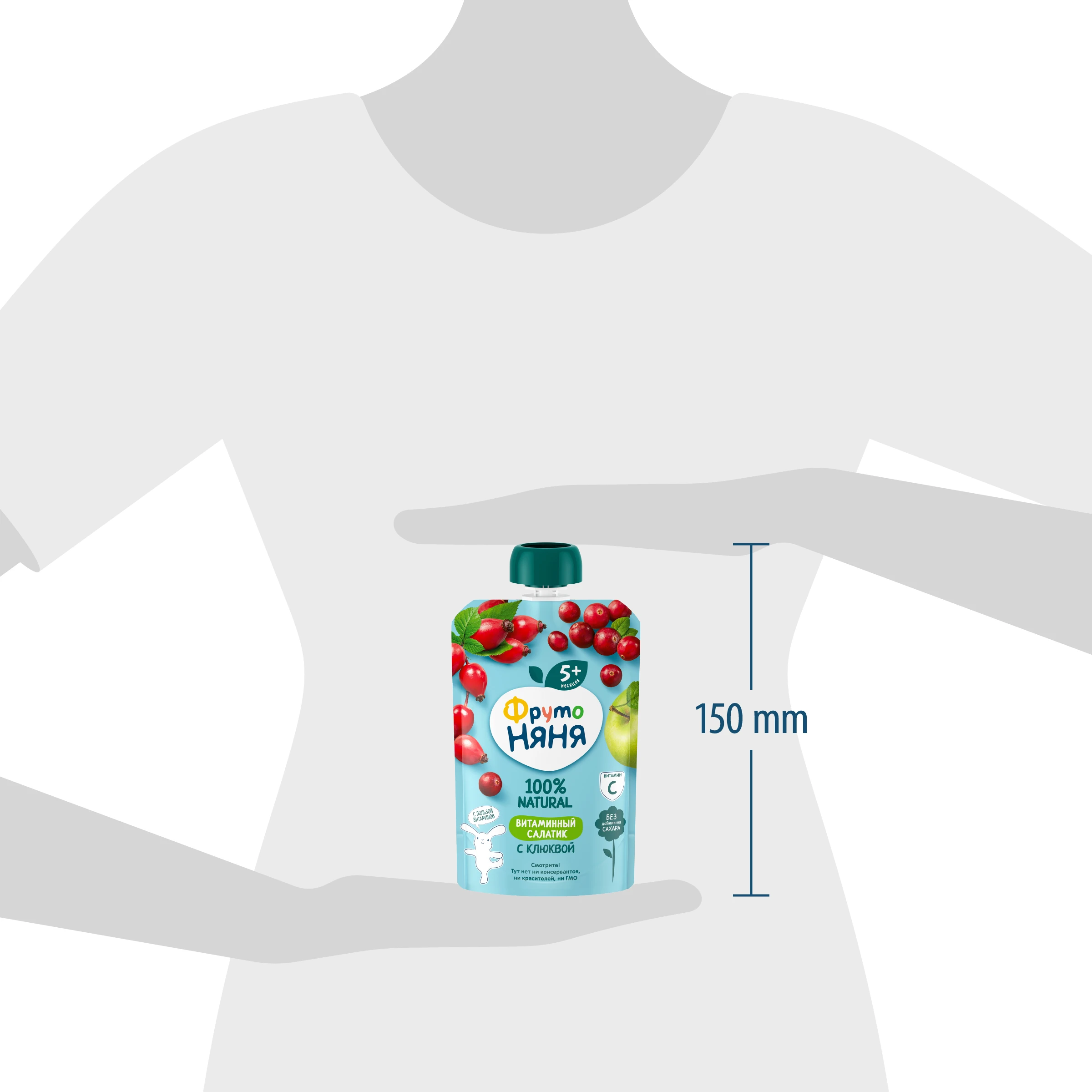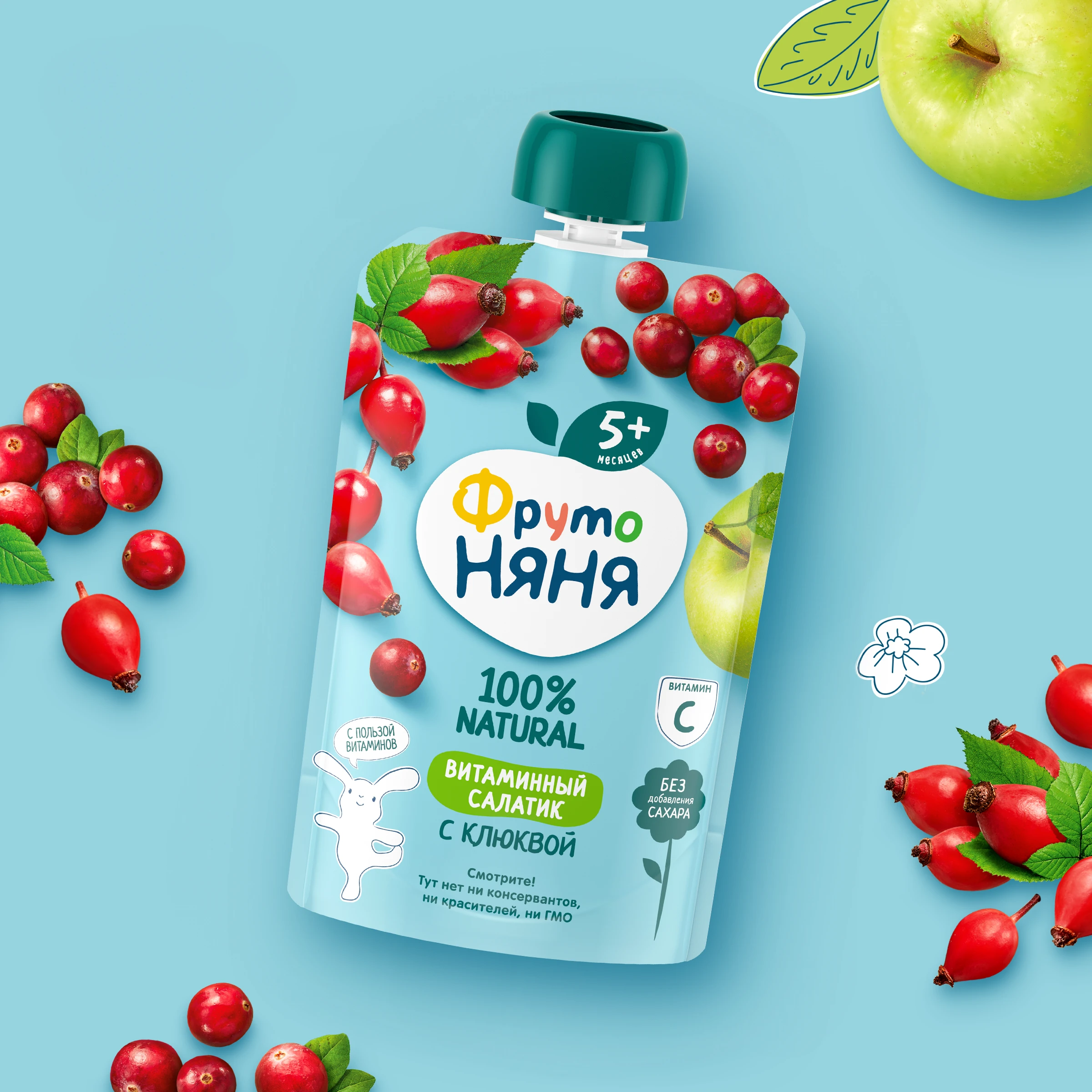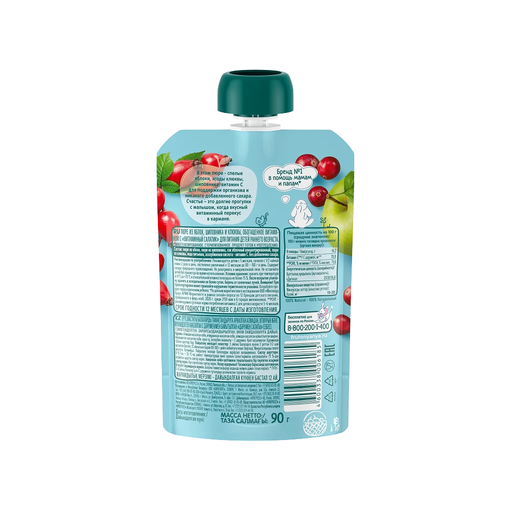 Apple puree, rosehip puree, apple juice concentrate, cranberry puree, drinking water, ascorbic acid (vitamin C). Vitamin C, mg 25 (RDI, % min. 71% for children aged 5-6 months.)