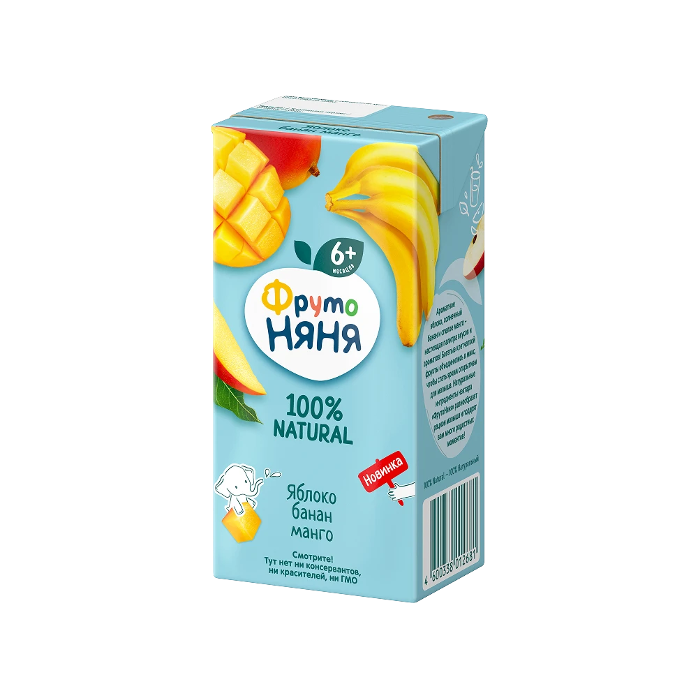 Apple juice, banana purée, mango purée, sugar, acidity regulator: citric acid, water. Produced using juice concentrate. Volume fraction of fruit juice: 45% min.