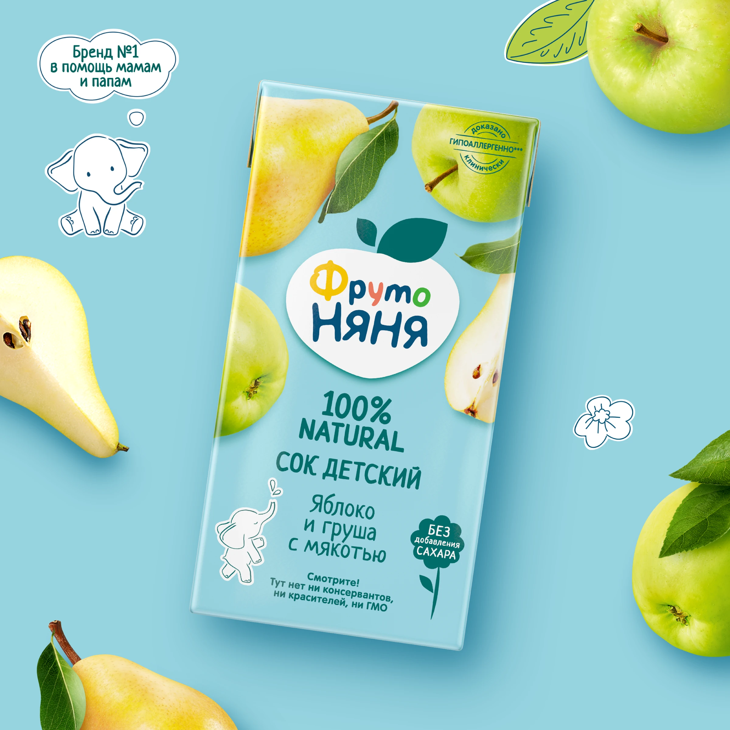 Apple juice, pear purée, pear juice, apple purée. Produced using juice and purée concentrates.