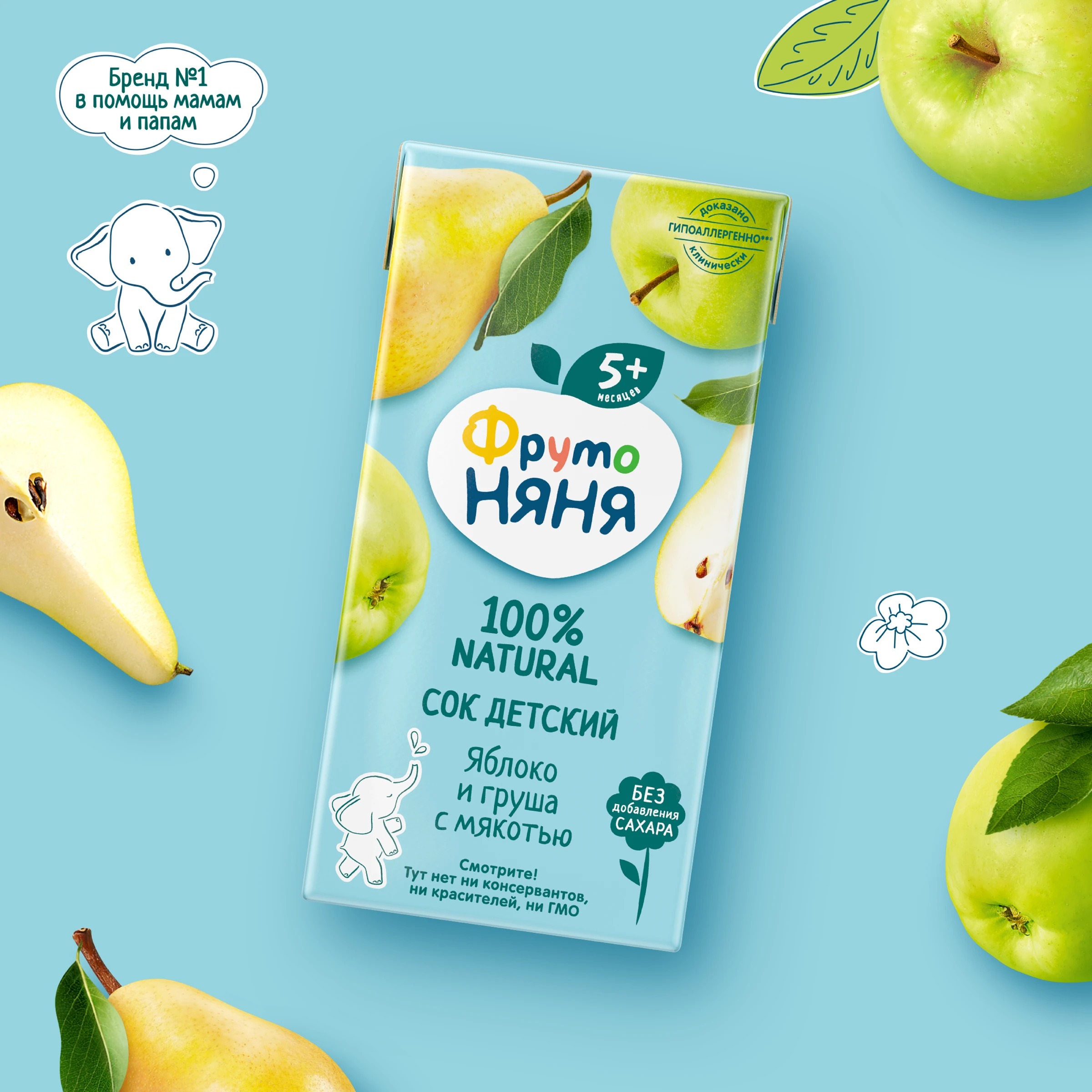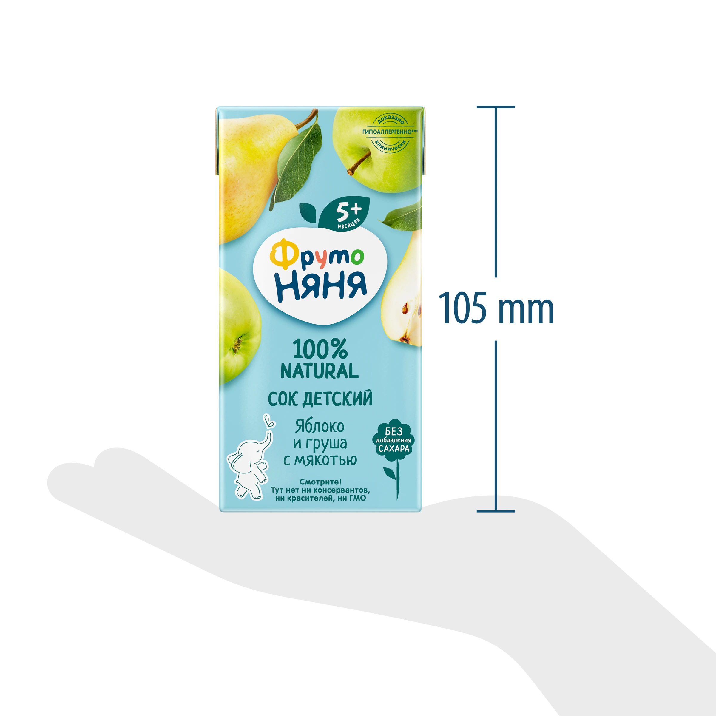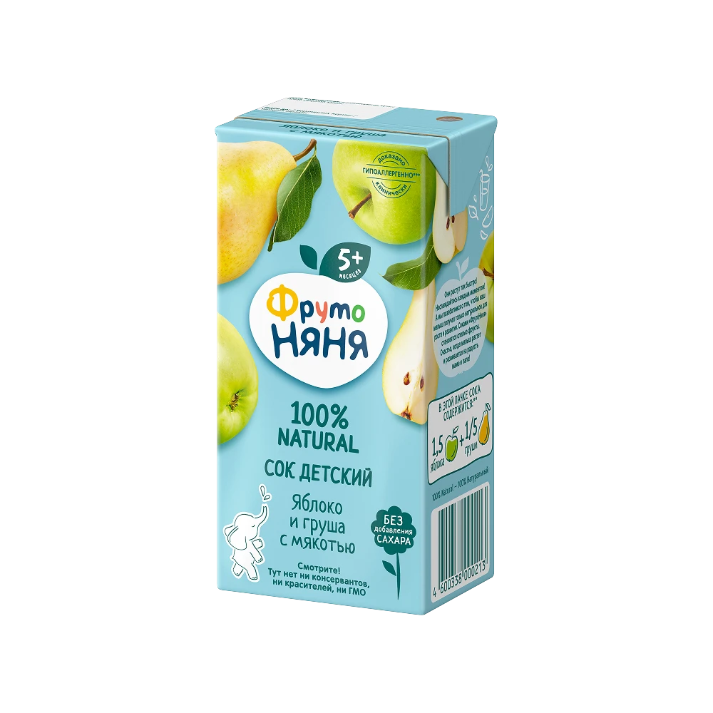 Apple juice, pear purée, pear juice, apple purée. Produced using juice and purée concentrates.