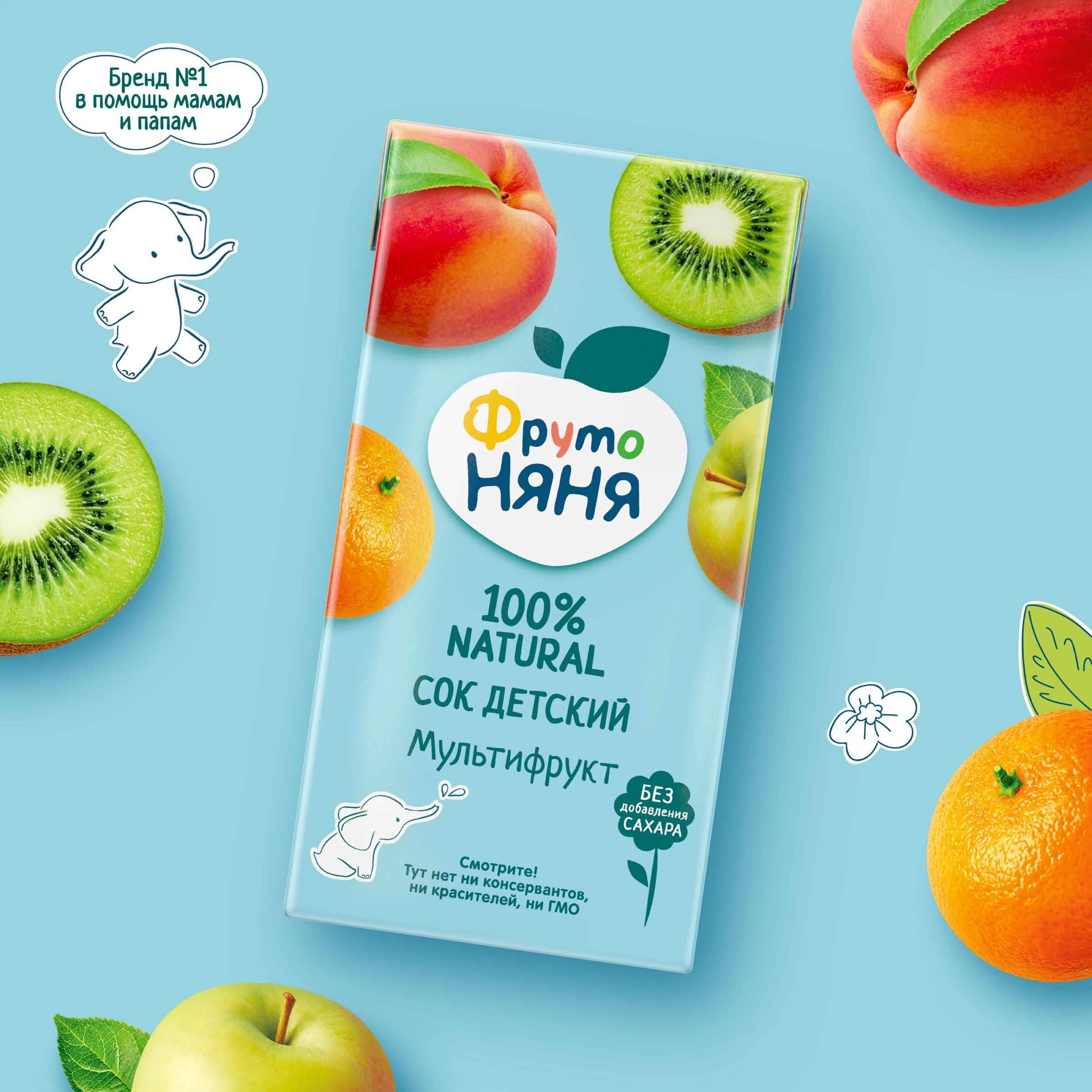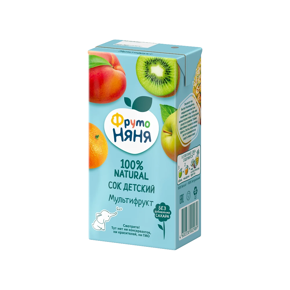 Apple juice, mandarin juice, pineapple juice, peach puree, passion fruit juice, kiwi puree. Made from concentrated juices and purees.