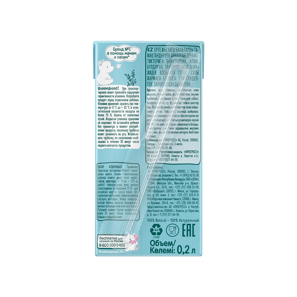 Ready-to-eat. Shake well before consumption. The porridge is recommended for children aged 6 months and older (120-150 g per day); increase the serving size up to 200 g by the age of 12 months. Taste the product before giving it to your child. Before feeding, pour the needed amount of porridge into a clean bowel. Warm up to feeding temperature (36-37 °C), if necessary, and stir. The product can be consumed from a feeding bottle, with a spoon or from a cup. Do not store if opened. Do not leave your child unattended while using the product, as the straw may become soaked in the mouth. Use the straw within 30 minutes from its first contact with the product.