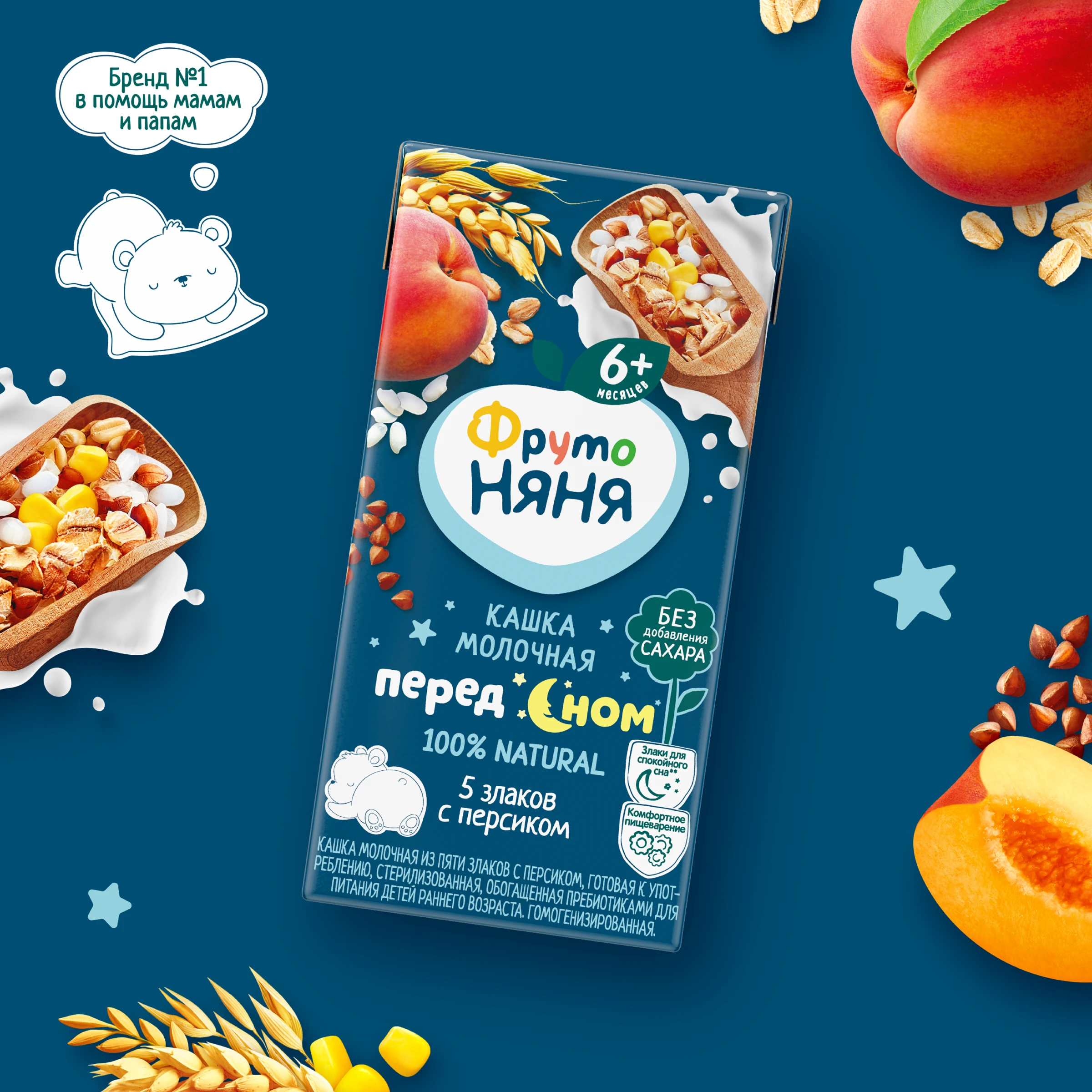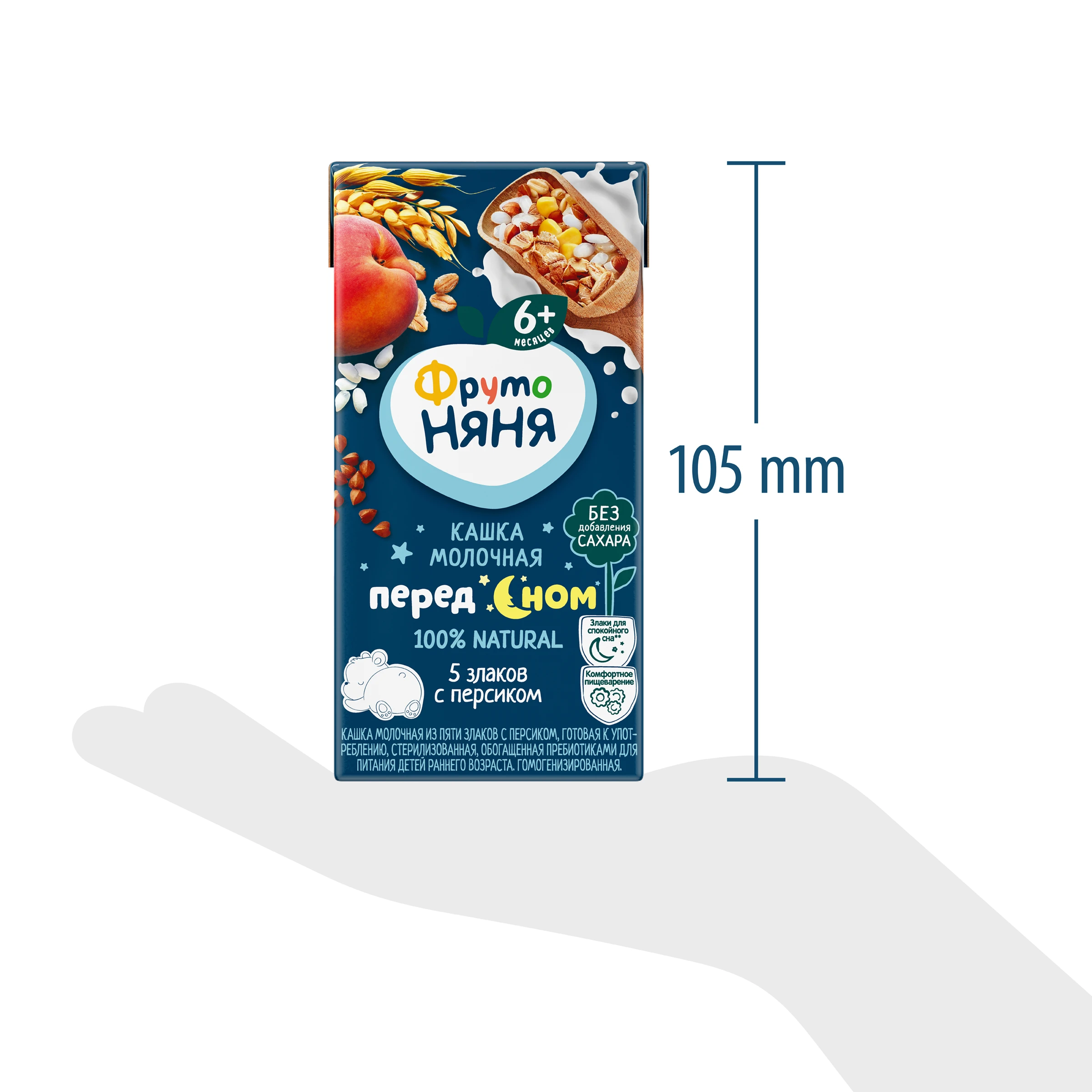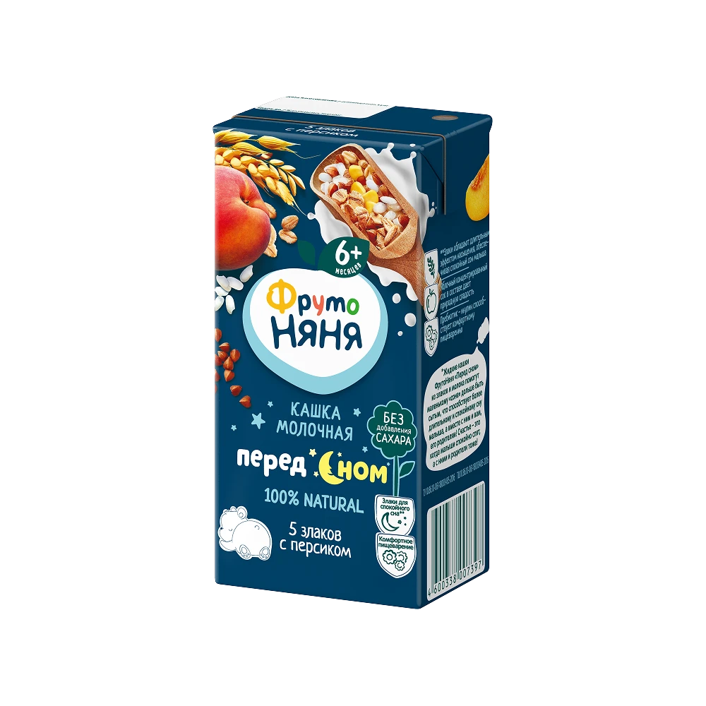 Whole milk powder, apple juice concentrate, peach puree, maltodextrin, rice flour, corn flour, wheat flour, buckwheat flour, oat flour, prebiotic: inulin, natural flavoring Peach, water. *Prebiotic inulin improves digestion ** Cereals make your baby feel full longer and sleep peacefully