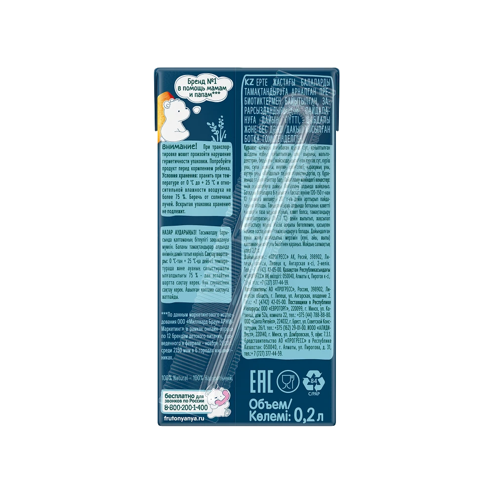 Ready-to-eat. Shake well before consumption. The porridge is recommended for children aged 6 months and older (120-150 g per day); increase the serving size up to 200 g by the age of 12 months. Taste the product before giving it to your child. Before feeding, pour the needed amount of porridge into a clean bowel. Warm up to feeding temperature (36-37 °C), if necessary, and stir. The product can be consumed from a feeding bottle, with a spoon or from a cup. Do not store if opened. Do not leave your child unattended while using the product, as the straw may become soaked in the mouth. Use the straw within 30 minutes from its first contact with the product.