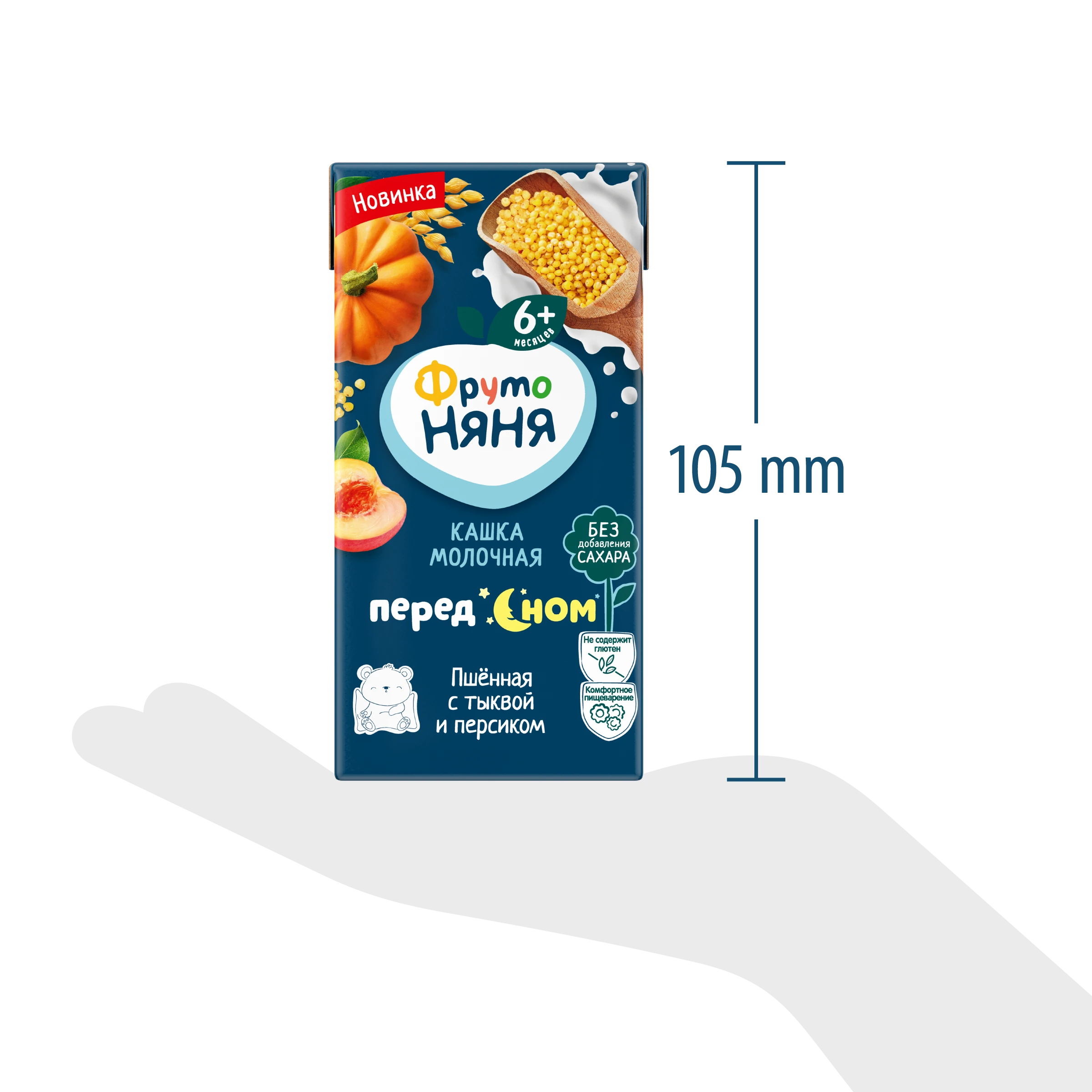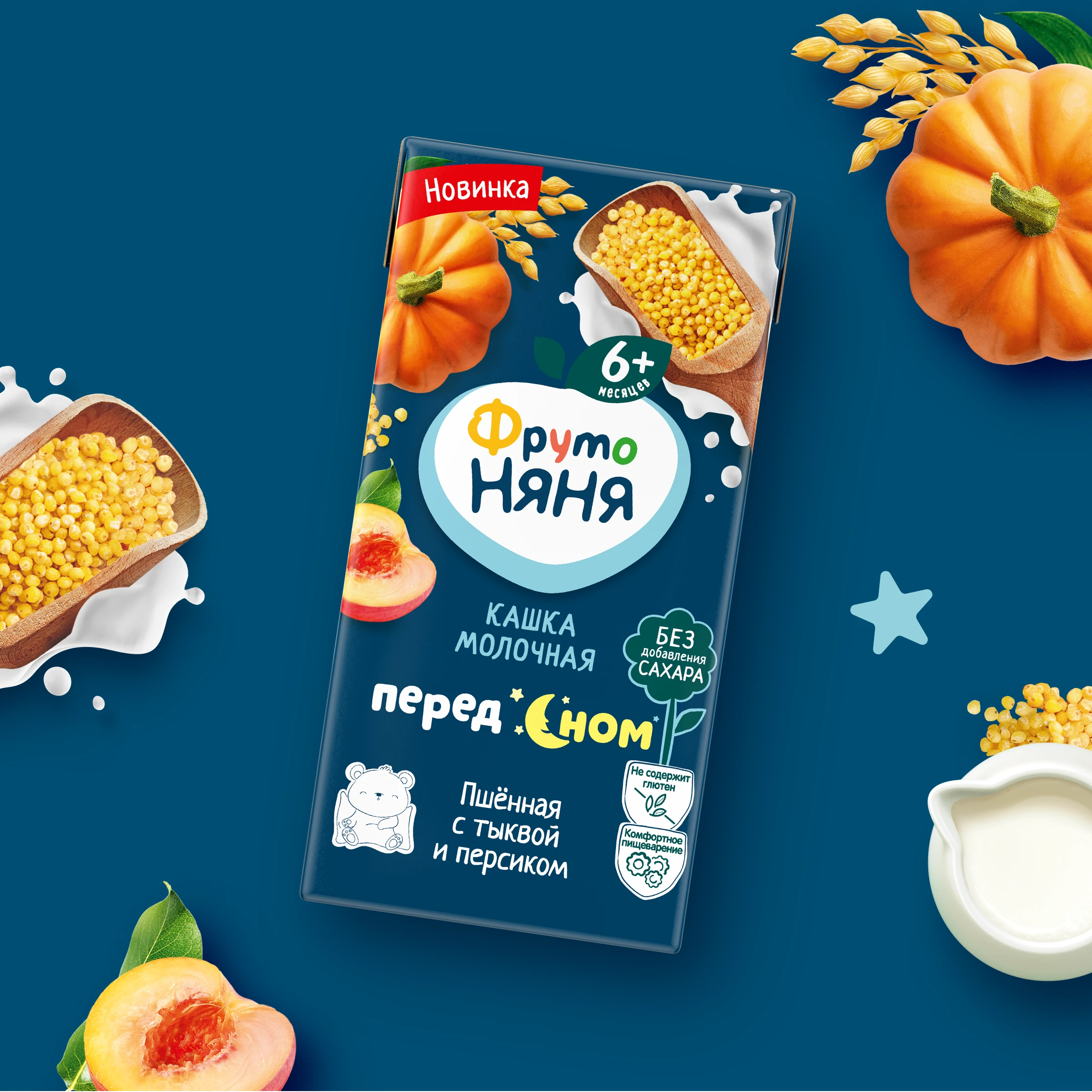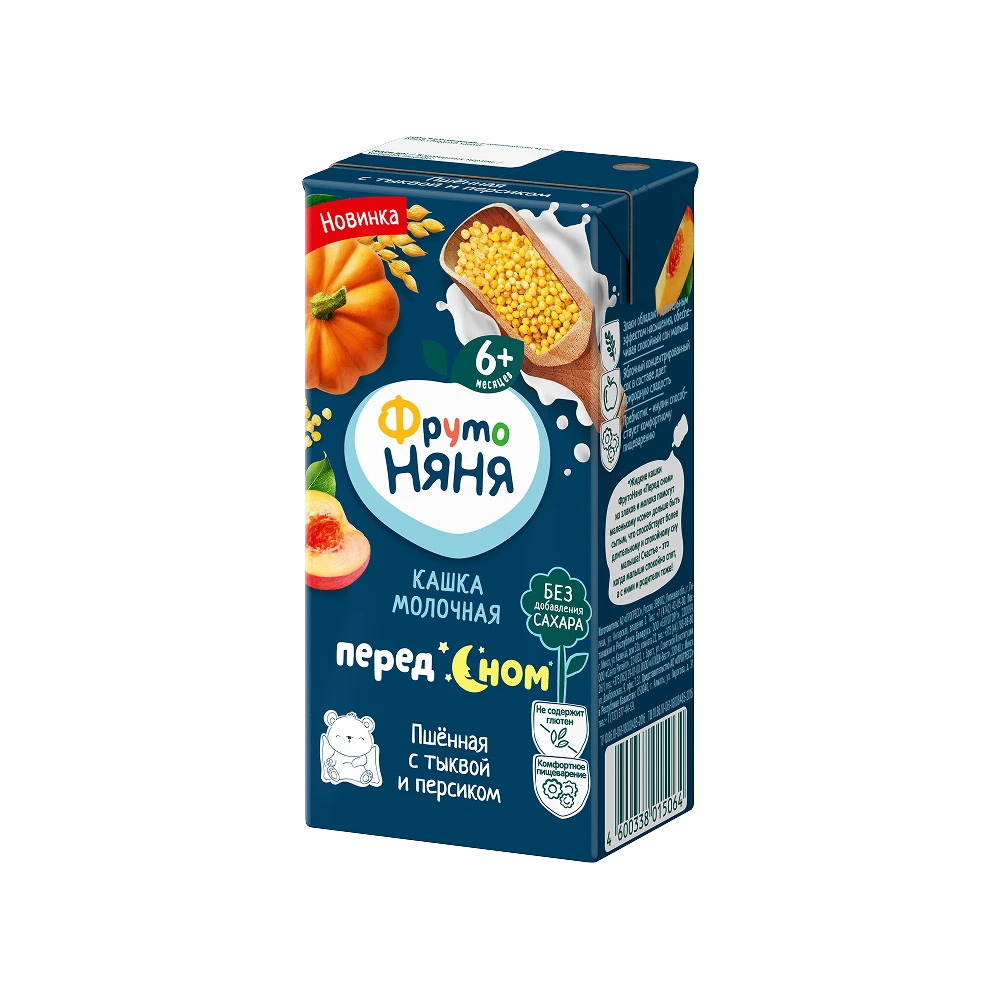 Whole milk powder, pumpkin puree, millet flour, apple juice concentrate, skimmed milk powder, maltodextrin, peach puree, prebiotic: inulin, water, acidity regulator: sodium citrates. Contains naturally occurring sugars. *Prebiotic inulin improves digestion ** Cereals make your baby feel full longer and sleep peacefully