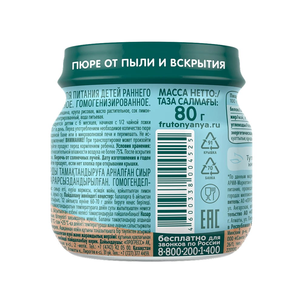 Store at a temperature between 0°C and +25°C, with relative humidity not exceeding 75%. After opening, keep the jar refrigerated and consume within 24 hours. Protect from direct sunlight. Attention! Packaging seal may be compromised during transport. Always taste the product before feeding your child.