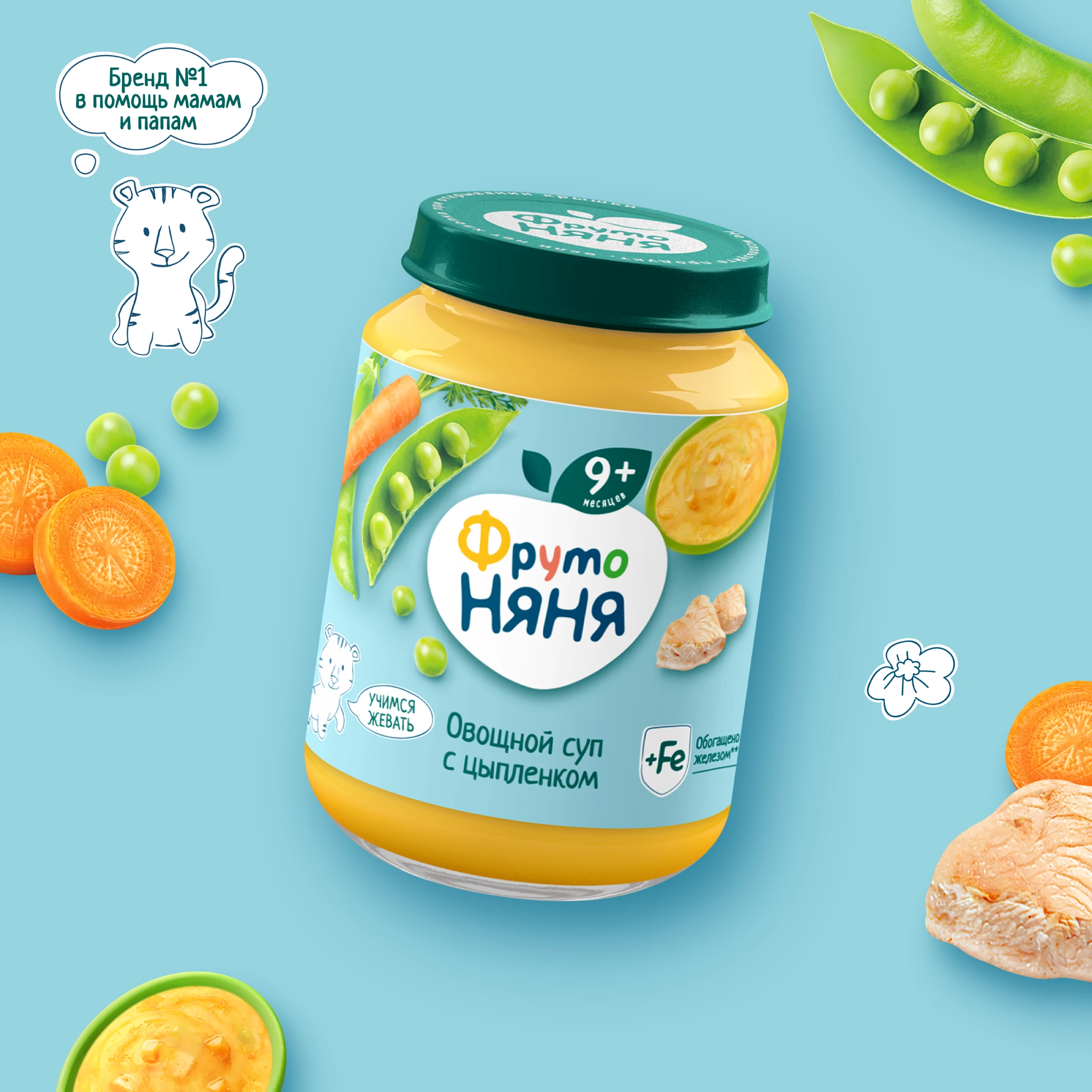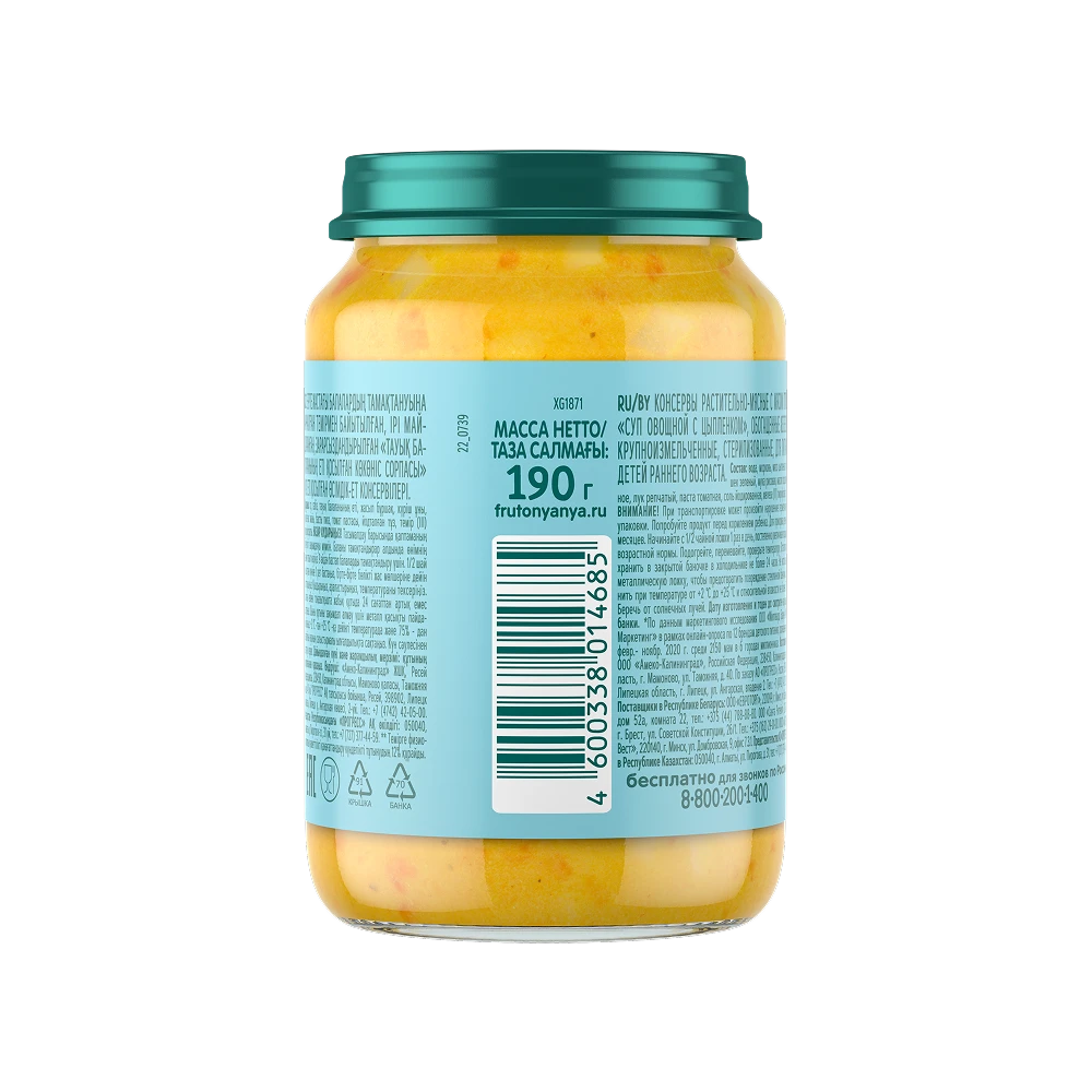 Water, carrot, chicken meat, green peas, rice flour, sunflower oil, onion, tomato paste, iodized salt, iron(III) pyrophosphate.