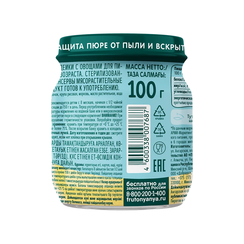 Store at a temperature between 0°C and +25°C, with relative humidity not exceeding 75%. After opening, keep the jar refrigerated and consume within 24 hours. Protect from direct sunlight. Attention! Packaging seal may be compromised during transport. Always taste the product before feeding your child.