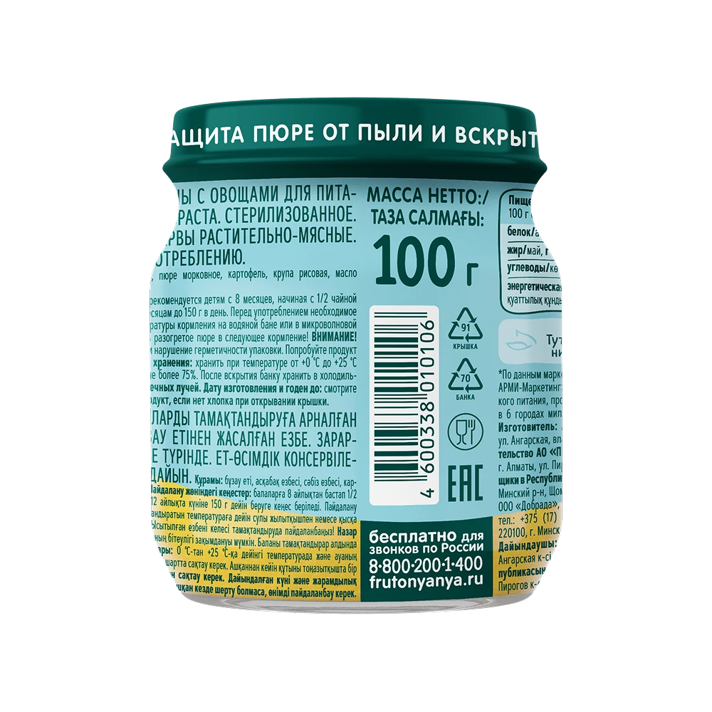 Store at a temperature between 0°C and +25°C, with relative humidity not exceeding 75%. After opening, keep the jar refrigerated and consume within 24 hours. Protect from direct sunlight. Attention! Packaging seal may be compromised during transport. Always taste the product before feeding your child.