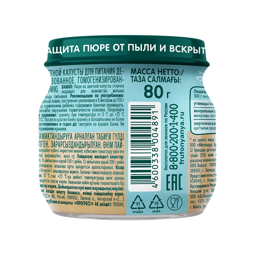 Cauliflower puree is recommended for babies from 4 months, starting with ½ teaspoon, gradually increasing to 150 g per day by 6 months and 200 g per day by 12 months. Stir well before feeding.