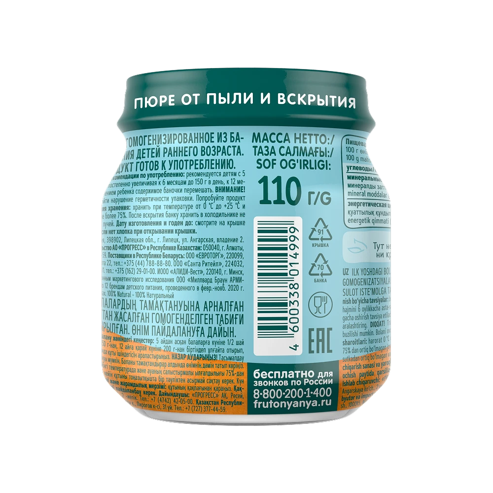 Store at a temperature between 0°C and +25°C, with relative humidity not exceeding 75%. After opening, keep the jar refrigerated and consume within 24 hours. Protect from direct sunlight. Attention! Packaging seal may be compromised during transport. Always taste the product before feeding your child