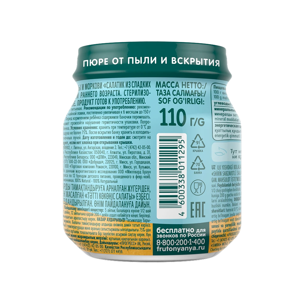 Store at a temperature between 0°C and +25°C, with relative humidity not exceeding 75%. After opening, keep the jar refrigerated and consume within 24 hours. Protect from direct sunlight. Attention! Packaging seal may be compromised during transport. Always taste the product before feeding your child
